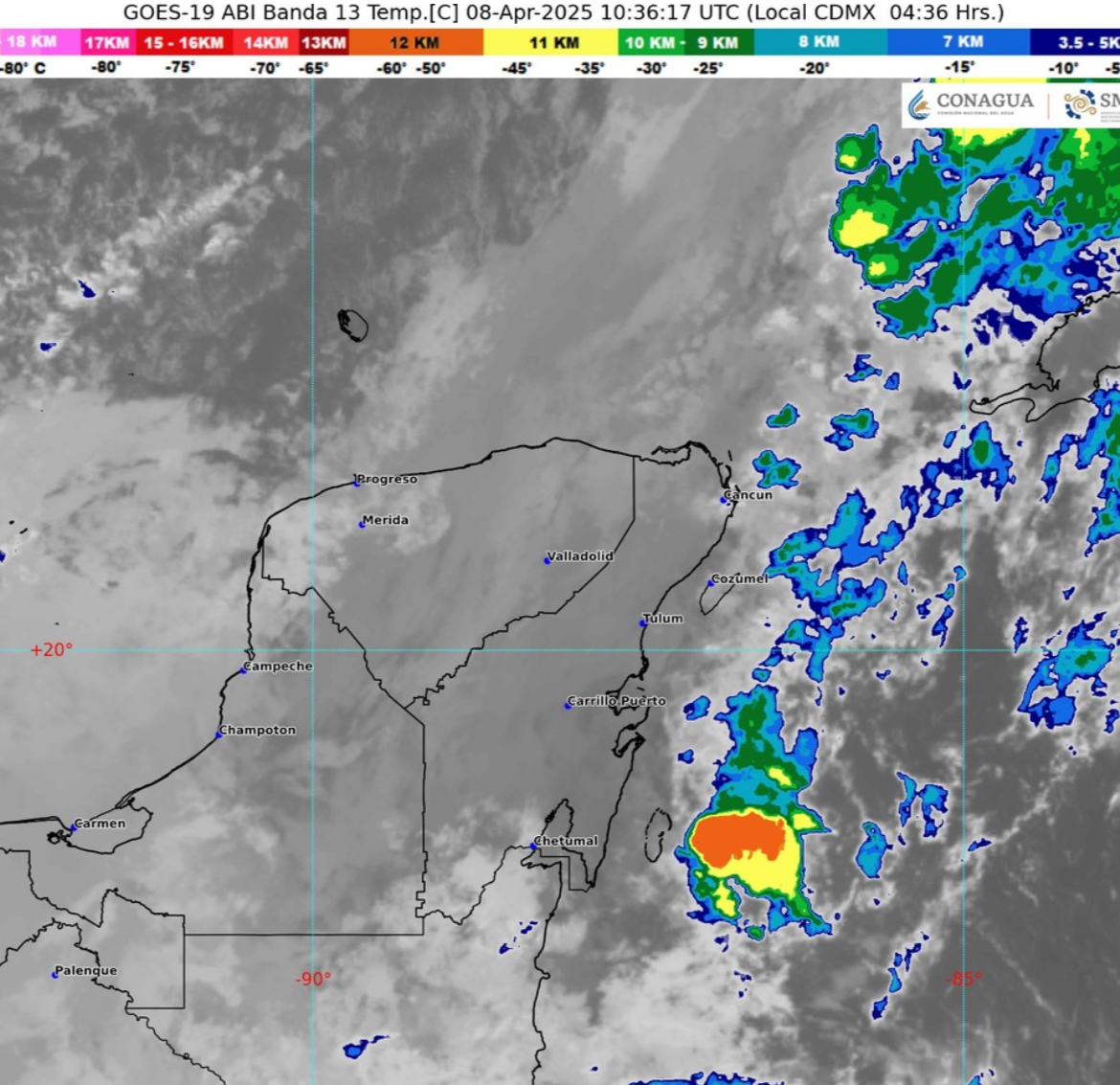 Durante la tarde, ambiente cálido en zonas de Campeche, Yucatán y Quintana Roo; con lluvias puntuales fuertes y descargas eléctricas en Campeche y Quintana Roo, las cuales podrían originar encharcamientos e inundaciones; además de chubascos en Yucatán.