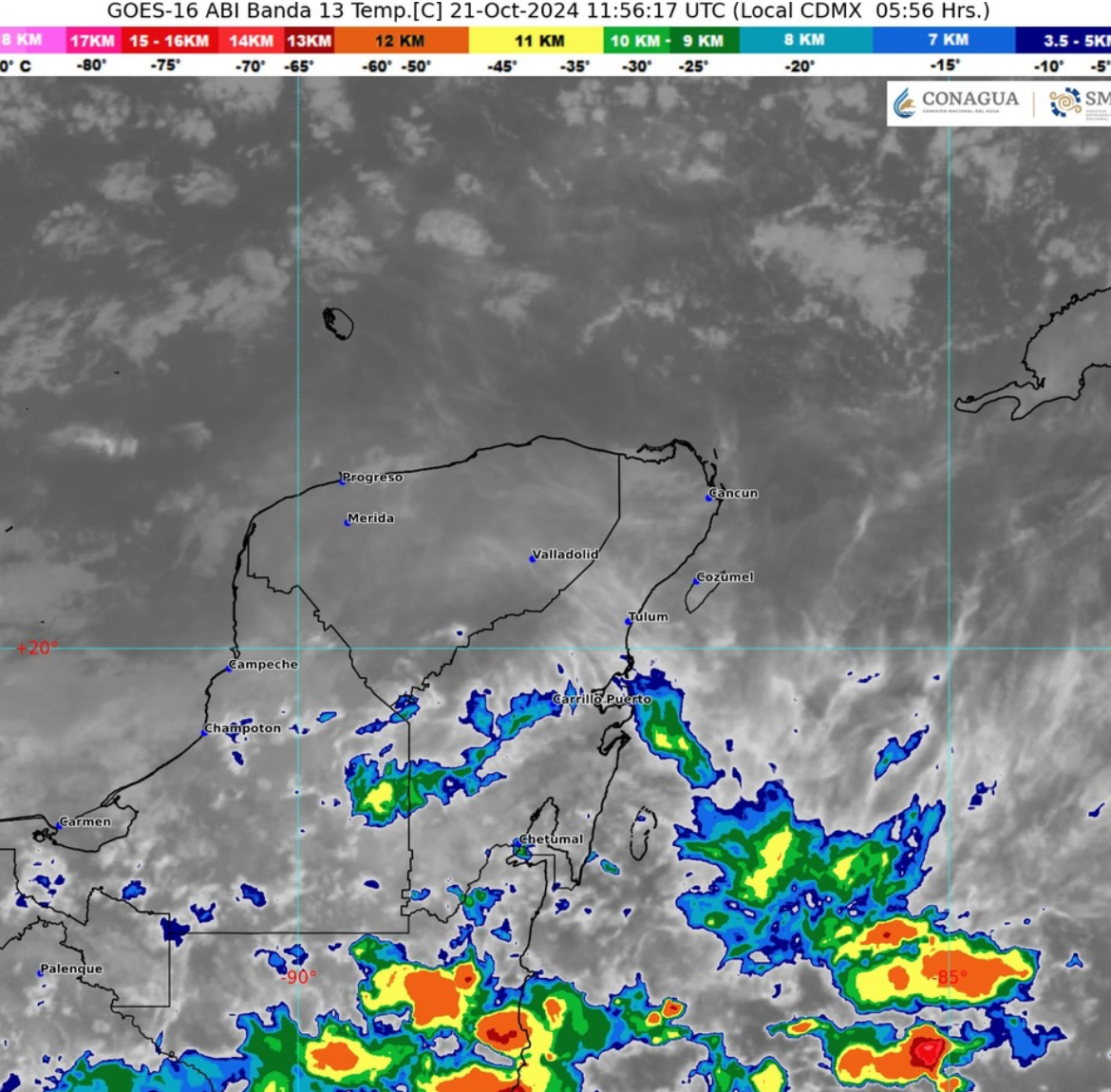 Cielo medio nublado a nublado durante el día, con lluvias puntuales muy fuertes en Campeche; fuertes en Quintana Roo, las cuales podrían generar encharcamientos e inundaciones; así como chubascos en Yucatán.