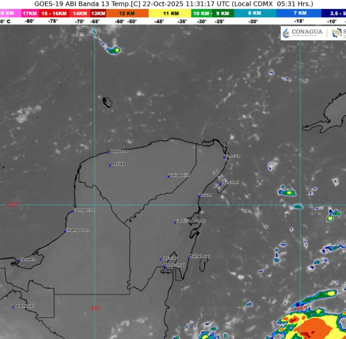 Cielo medio nublado a nublado durante el día, con lluvias puntuales fuertes en Campeche (oeste), Yucatán (sur) y Quintana Roo (norte, centro y sur); las lluvias antes mencionadas estarán acompañadas con descargas eléctricas y fuertes rachas de viento; así como reducir la visibilidad en tramos carreteros, originar encharcamientos e inundaciones.