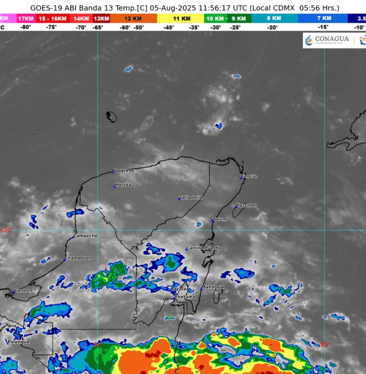 Una zona de baja presión con probabilidad para desarrollo ciclónico situada al sureste de las costas de Chiapas y el ingreso de aire húmedo del mar Caribe sobre la península de Yucatán, propiciará lluvias puntuales muy fuertes en Campeche y puntuales fuertes en Quintana Roo y Yucatán.