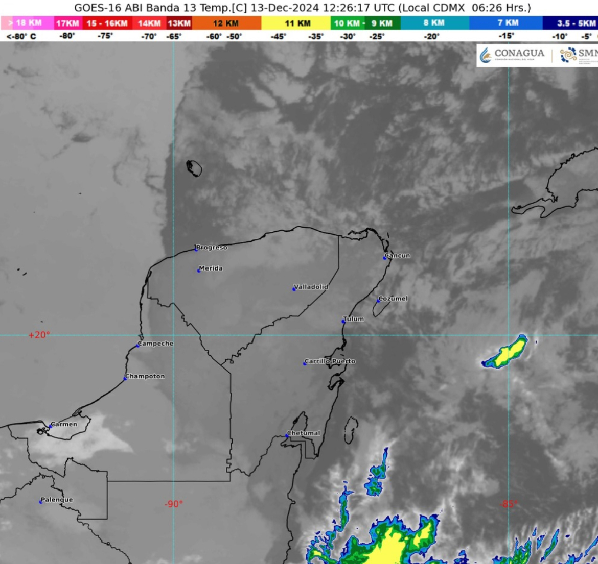 Viento del noreste de 15 a 25 km/h con rachas de 30 a 50 km/h y oleaje de 2 a 3 metros de altura en las costas de Yucatán y Quintana Roo.